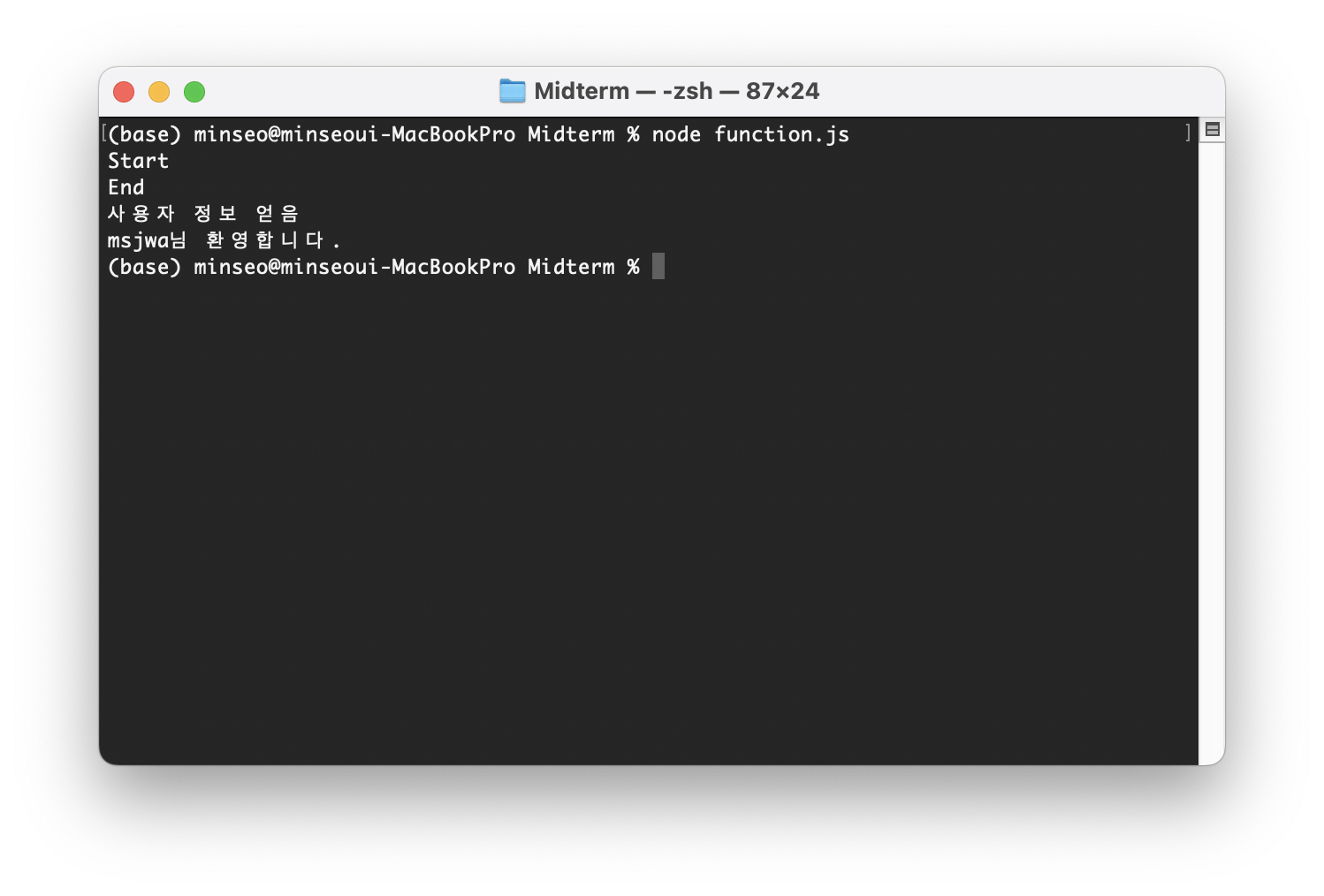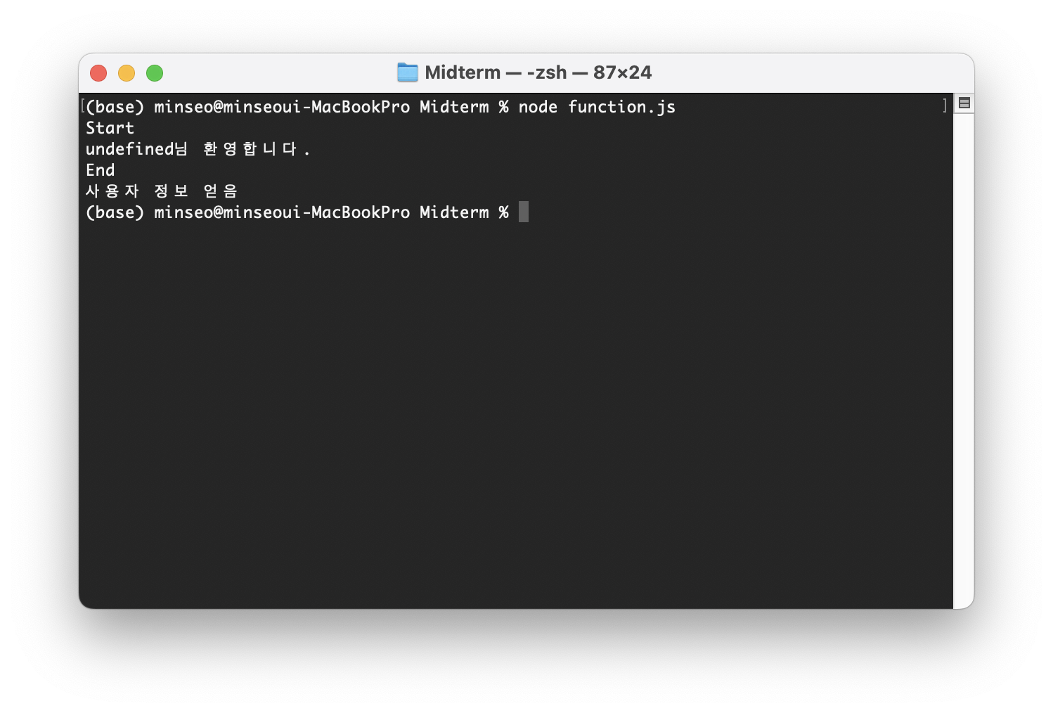 출력 결과에서 사용자 정보 얻기 전에 'undefined님 환영합니다.'가 먼저 출력됐다. 이유는 간단하다. 노드가 비동기 방식으로 코드를 처리하기 때문이다. 이런 상황을 방지하기 위해 Callback을 사용하여 비동기 작업의 완료를 처리하고 결과를 처리할 수 있습니다.
