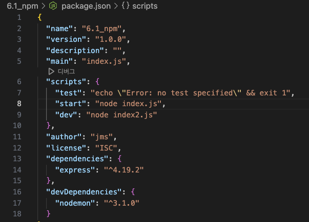 - 아래는 npm i -D nodemon을 했을 경우 package.json 내용 일부. 맨 아래에 devDependencies가 추가된 것을 볼 수 있다.