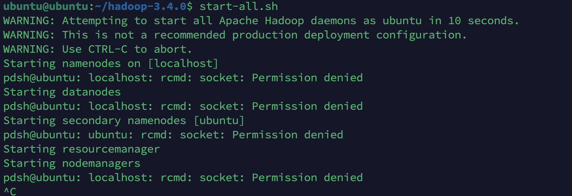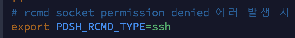 원인은 pdsh 기본 rcmd가 ssh가 아닌 rsh로 되어 있다. 즉, ssh 원격 로그인 인증이 동일하지 않을 때 발생한다.