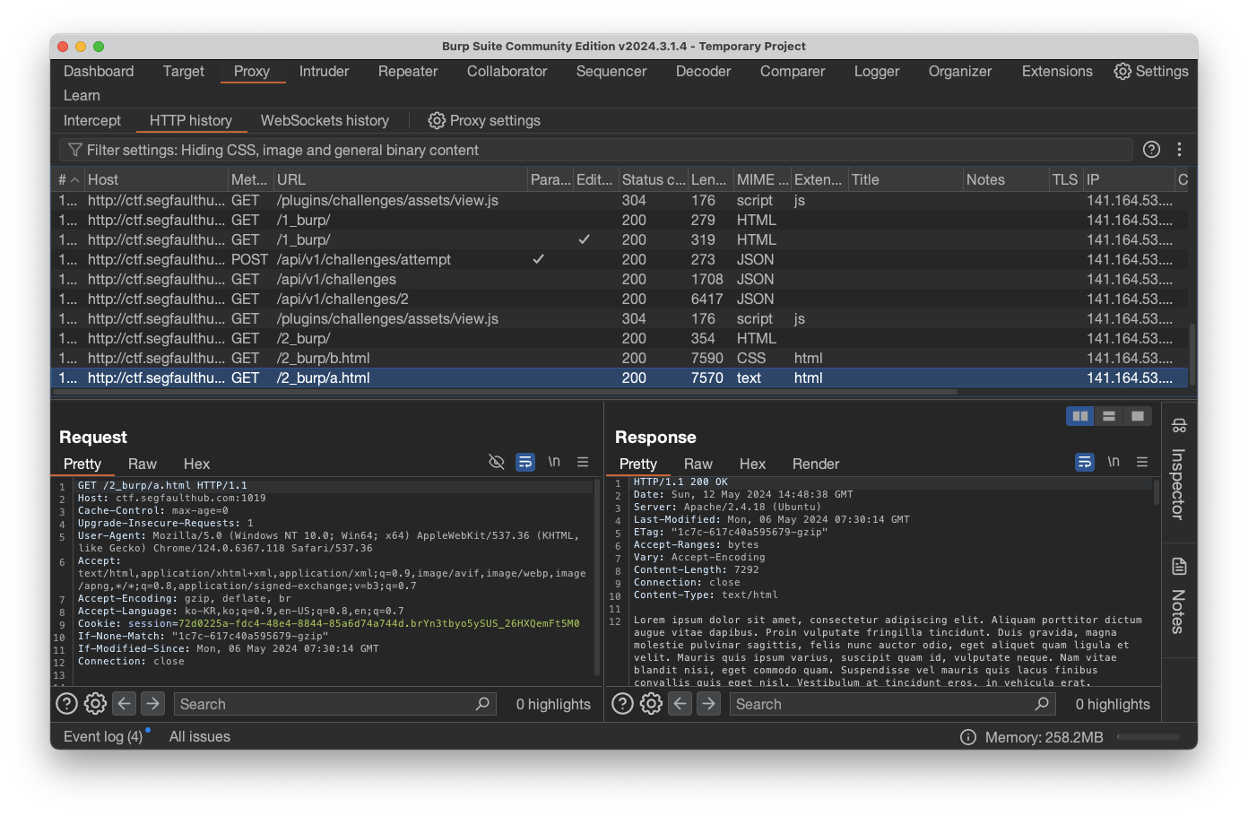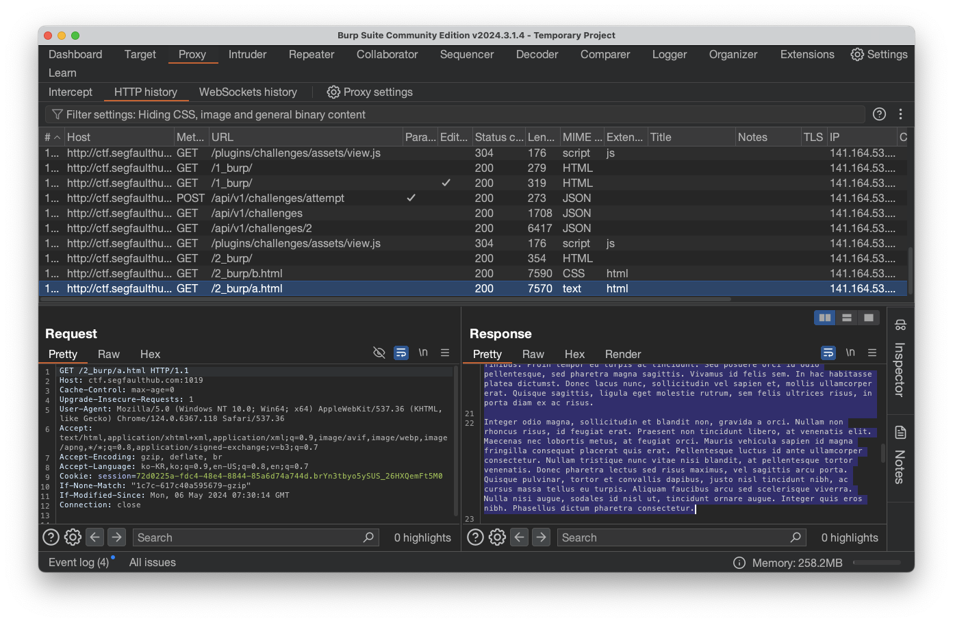 브라우저를 확인하면 위와 같이 축하한다는 메시지가 나온다. 한 번 더 burp에서 HTTP history를 확인해 보면