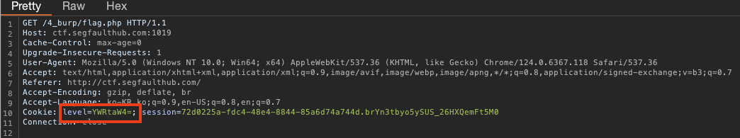 인터셉트를 켜고 level 부분의 값에 admin을 base64 방식으로 인코딩한 결과를 입력하고 보낸다.