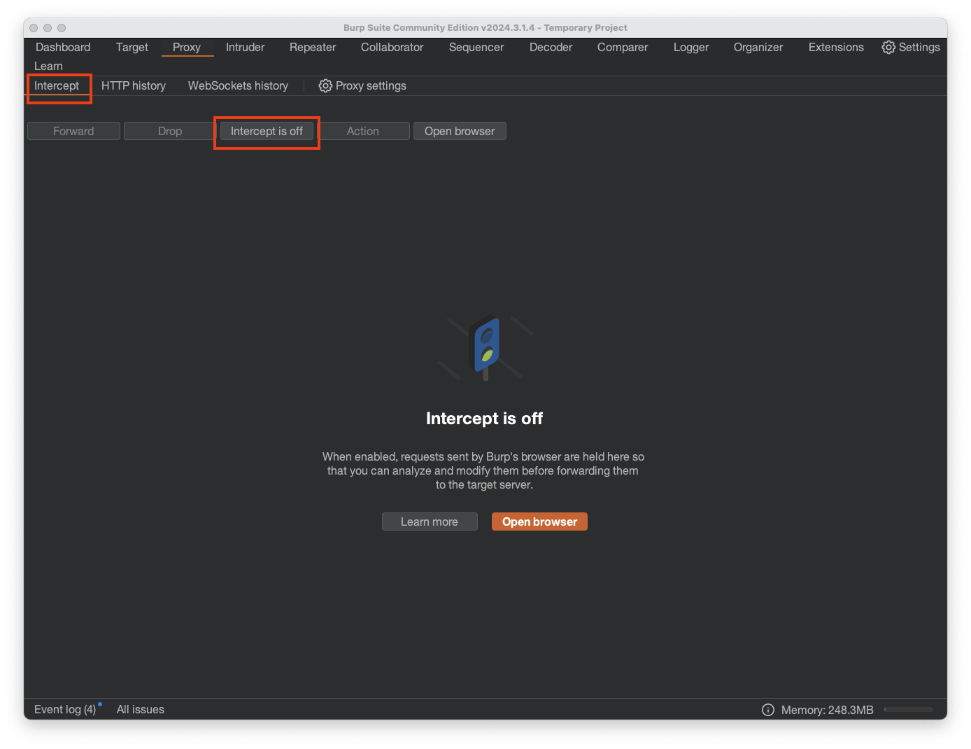 Intercept로 이동해서 현재는 꺼져있는 intercept 기능을 켜준다.