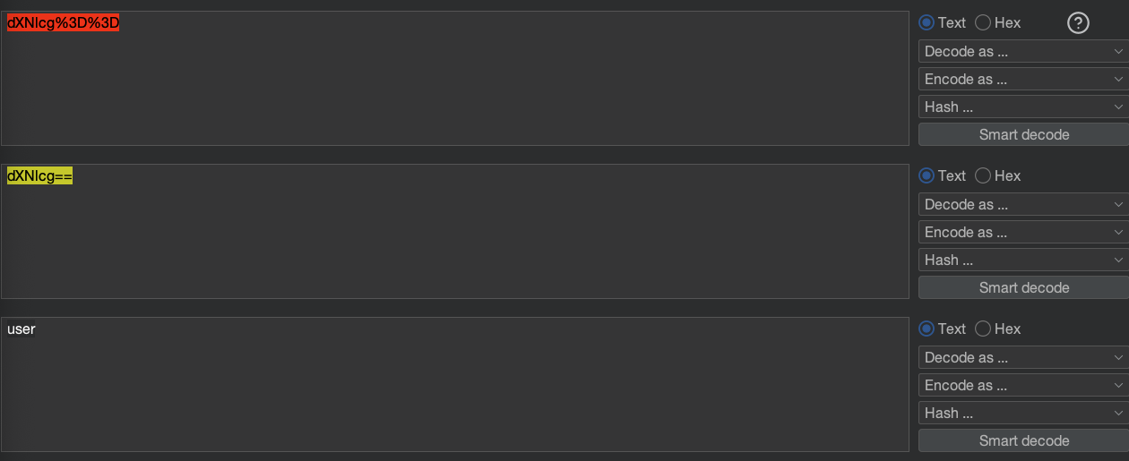 먼저 URL 방식으로 디코딩해봤다. URL 방식의 색상인 빨간색으로 내가 입력한 값이 decode 된 것을 볼 수 있고, dXNlcg==라는 결과가 나왔다.