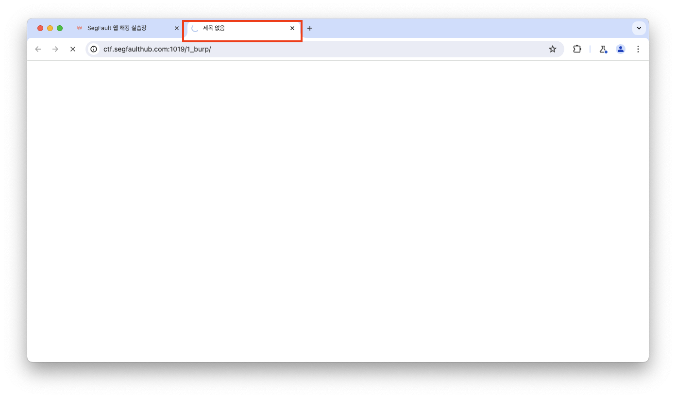 burp에서 요청을 서버에 보내지 않고 멈춰두고 있기 때문에 웹 사이트는 요청을 보낸 상태에서 멈춰 있다. 이때 burp를 확인해 보면