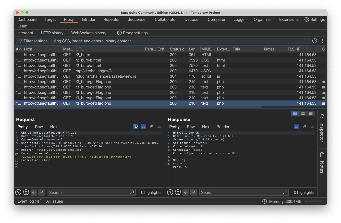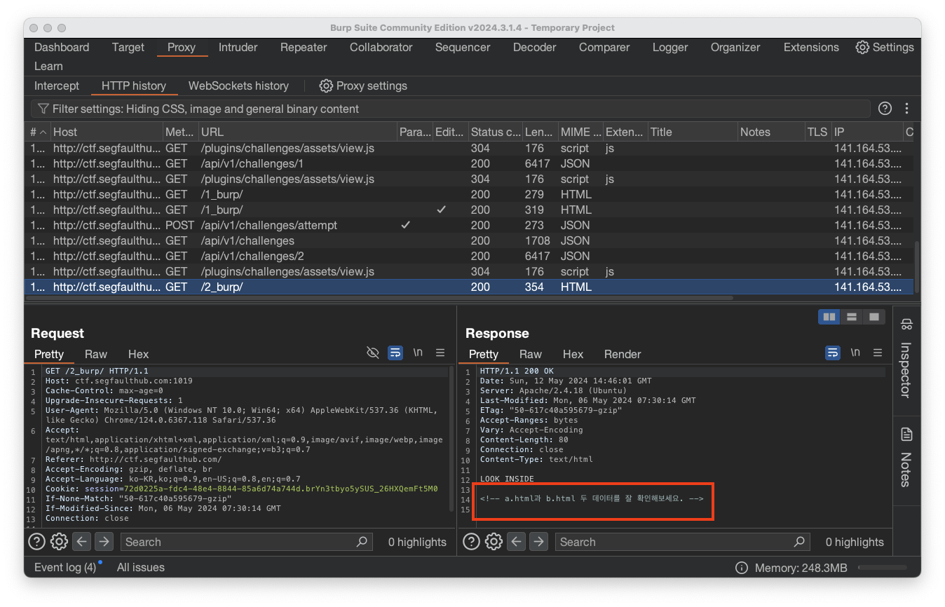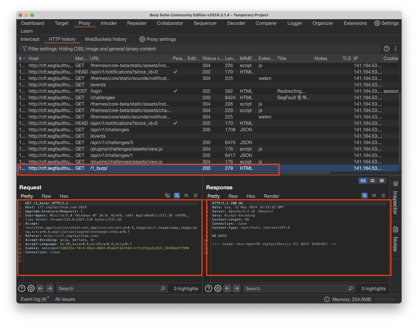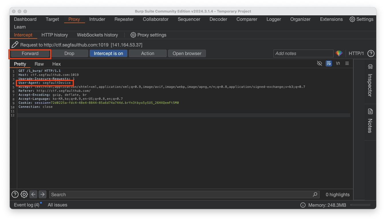 지금까지 요청된 기록이 모두 남아있고, 현재 접속한 링크에 대한 요청과 응답 기록도 볼 수 있다. Response 부분을 보면 주석처리로 된 문장이 있다. User-Agent에 segfaultDevice라고 넣어서 요청을 보내라고 한다. User-agent란 사용자가 사용하는 브라우저를 나타낸다. User-agent를 변경하기 위해서는 웹 사이트의 요청을 중간에 가로챈 다음 데이터를 수정해서 서버로 보내야 한다. 이때를 위해 Intercept를 사용해 보겠다.