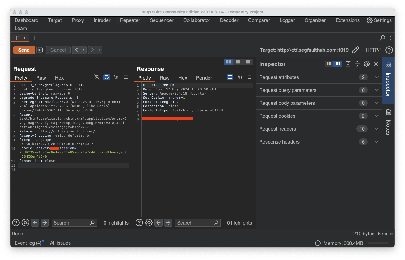 새로고침을 해봤지만 응답에 변경되는 점이 보이지 않는다. 요청 부분을 보면 Cookie에 answer라는 파라미터가 있고 1이라는 값이 할당되어 있다. 앞에 힌트에서 1부터 20이라는 숫자를 힌트로 줬기 때문에 이번에도 중간에 웹 사이트 요청을 인터셉트해서 answer부분의 값을 1부터 20까지 하나씩 넣어보면서 응답 결과를 확인하면 찾을 수 있을 것 같다. 하지만, 이렇게 하면 너무 복잡하고 귀찮기 때문에 Repeater라는 기능을 사용해 보자. Repeater는 burp에서 지원하는 반복되는 요청과 응답 결과를 보다 쉽게 확인할 수 있는 기능이다.