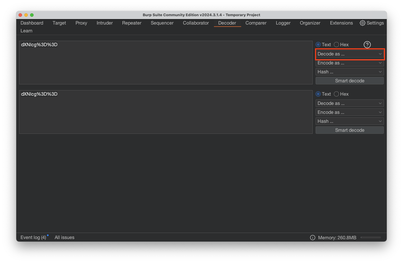 Decoder 탭으로 이동해서 level의 할당된 dXNlcg%3D%3D를 입력하고, 오른쪽 부분의 Decode as ... 탭에서 어떤 것으로 Decode 할지 선택할 수 있다.