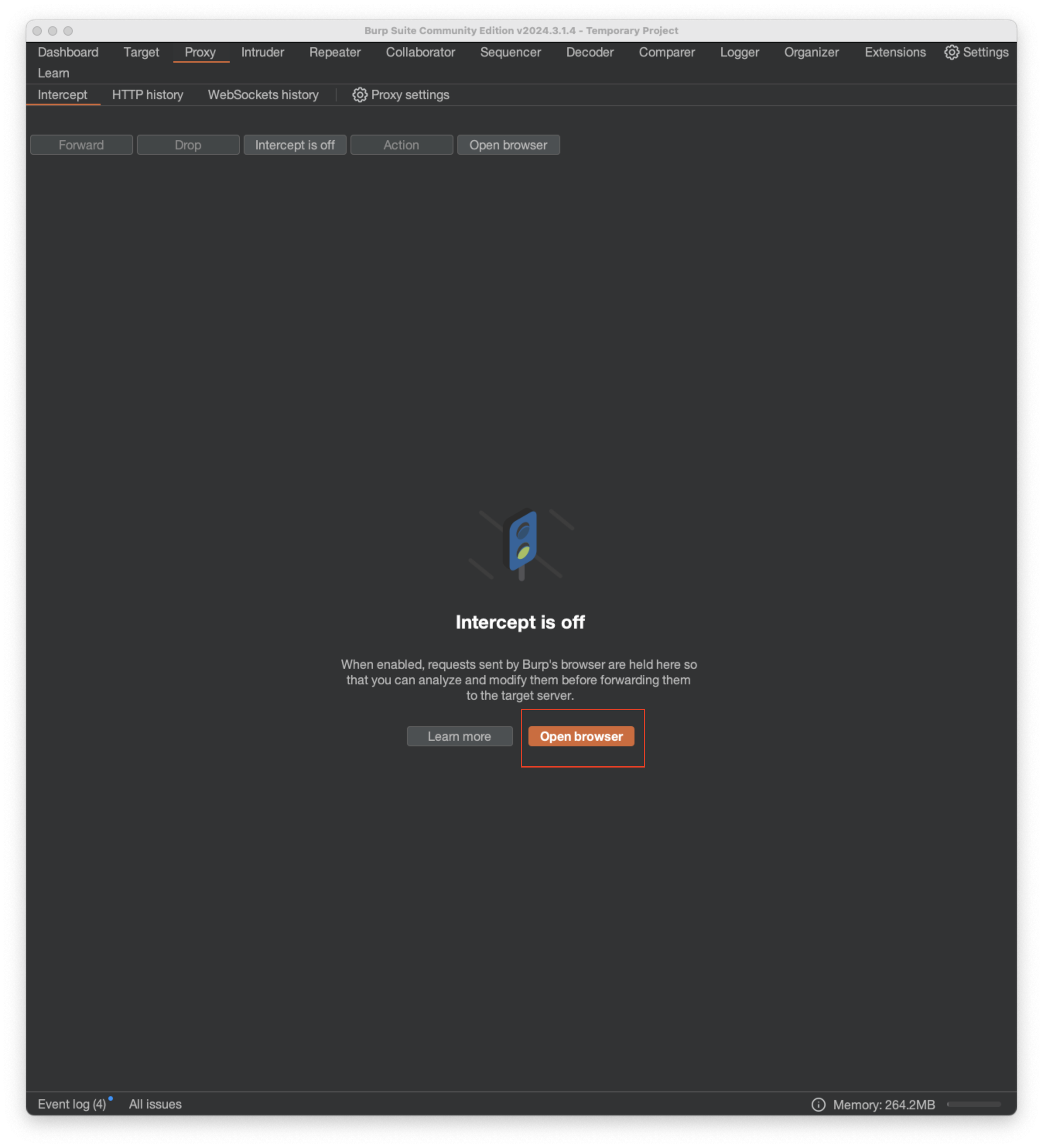 Open browser 버튼 클릭해서 프록시가 연결된 상태의 브라우저를 킨다.