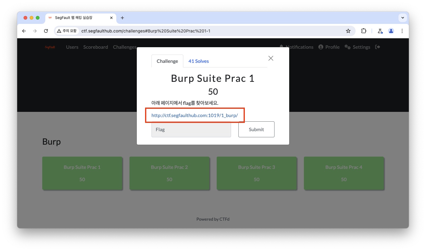 Burp Suite Prac1을 클릭하면 위 그림처럼 나온다. Flag란에는 해당 문제에서 찾은 플래그를 작성하고 Submit을 누르면 틀렸는지 맞았는지 확인해 준다. 먼저 링크로 들어가 보자