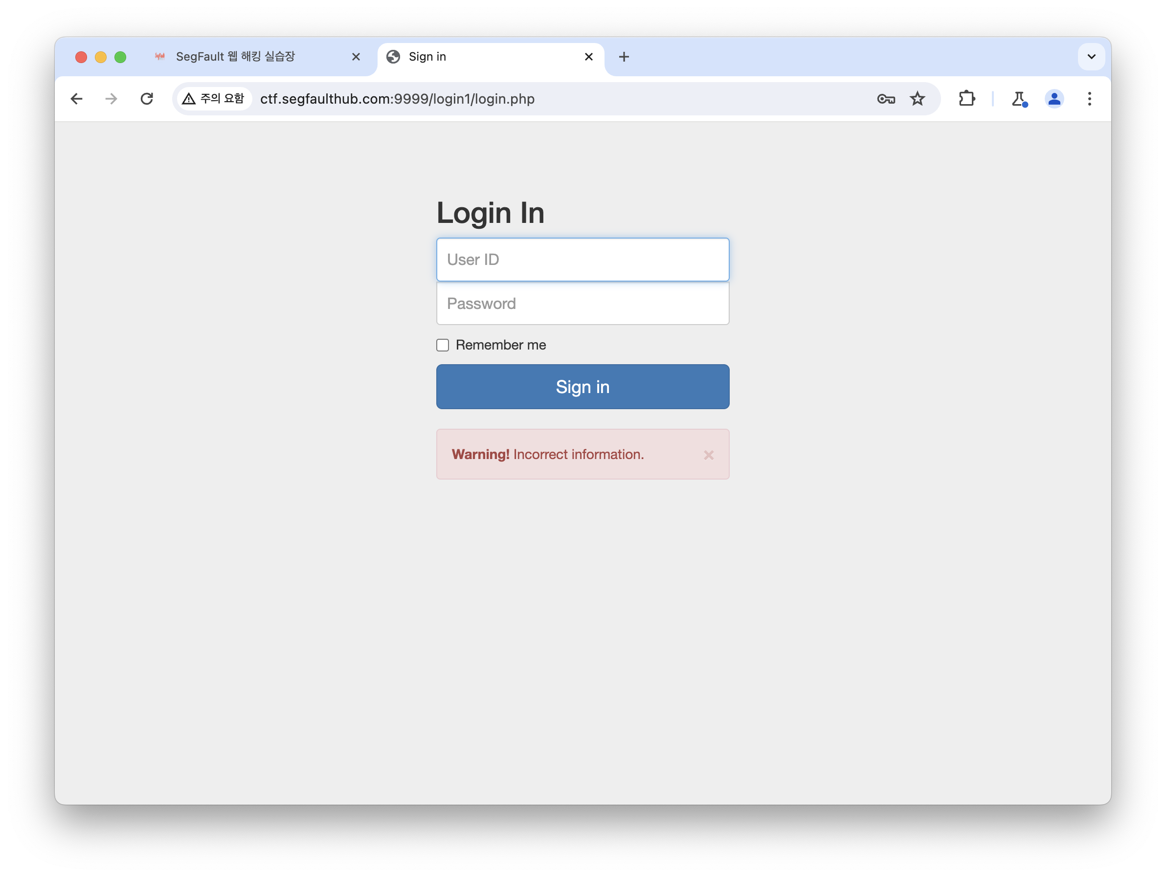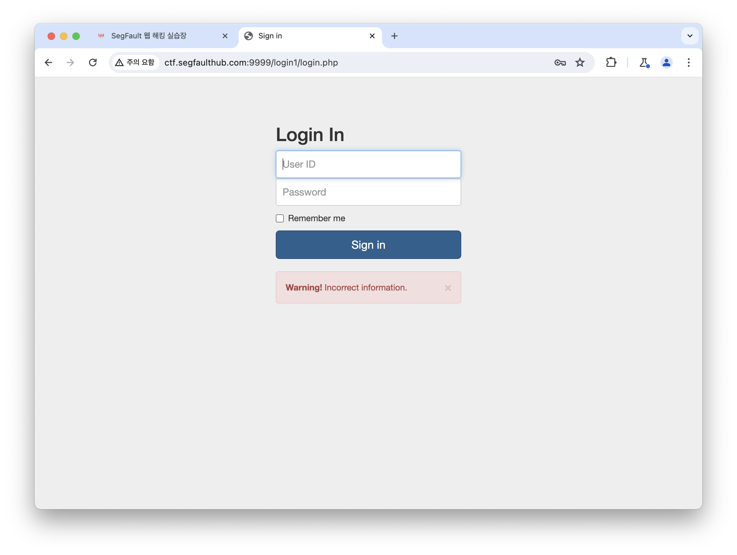 이번 문제도 Login Bypass 1과 비슷하게 같은? 화면에서 진행한다. 실제 주소는 다르다.