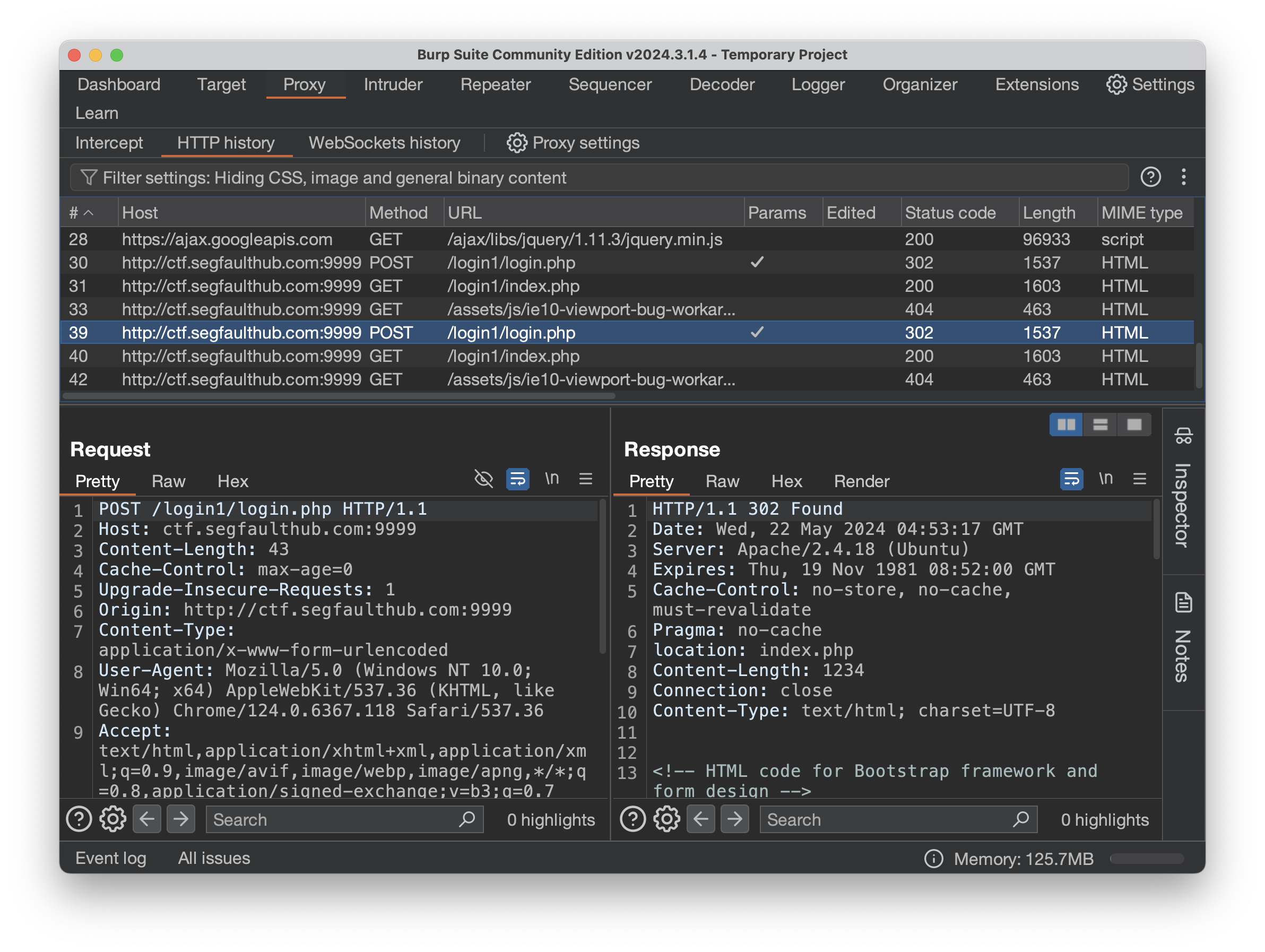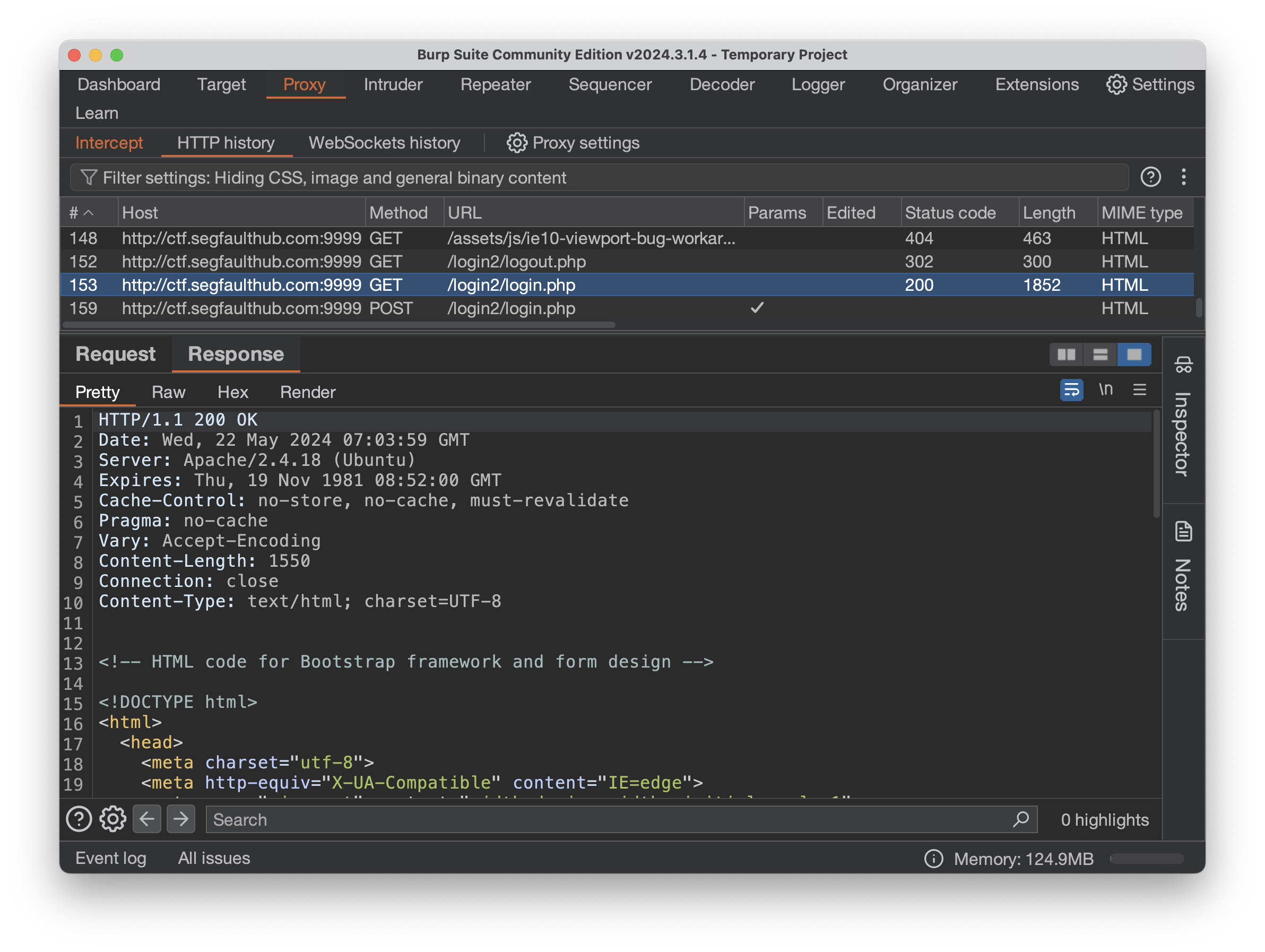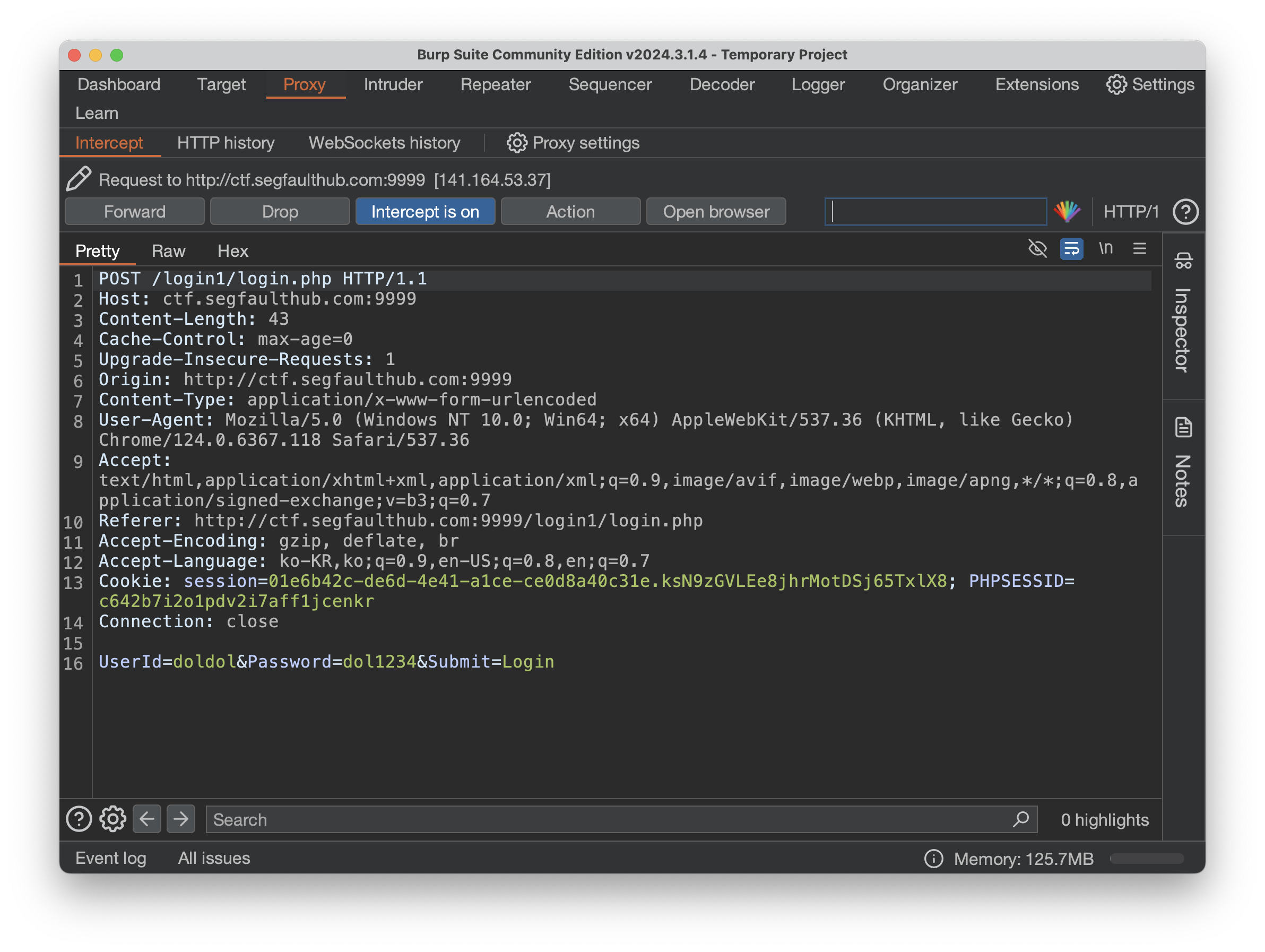burp suite으로 웹에서 서버로 보내는 request와 response를 확인해 봤다. POST 방식으로 전송을 하며 UserId, Password, Submit의 내용을 같이 전송한다. 아마 UserId 부분을 건드리면 해결할 수 있을 것 같다.