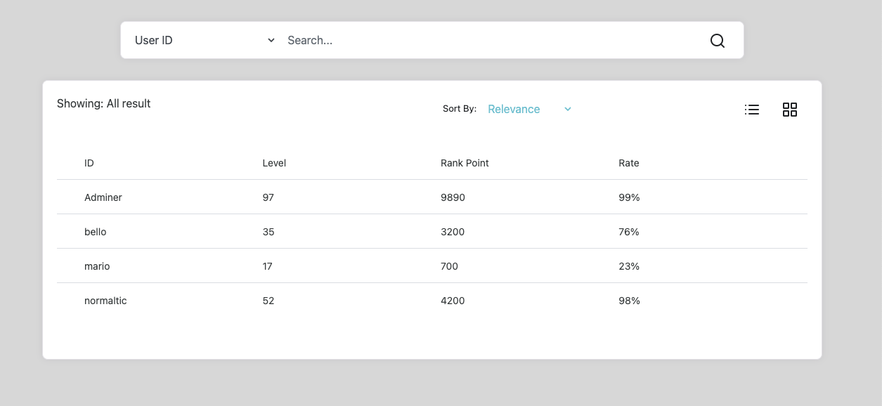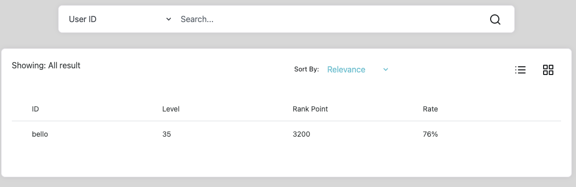 보다시피 검색 필터가 User ID로 되어 있으니 입력한 키워드와 서버 데이터베이스에 있는 데이터와 일치하면 그게 맞는 결과가 출력되는 것 같다. 위에서 확인할 수 있는 'bello'라는 아이디로 검색을 해봤다.