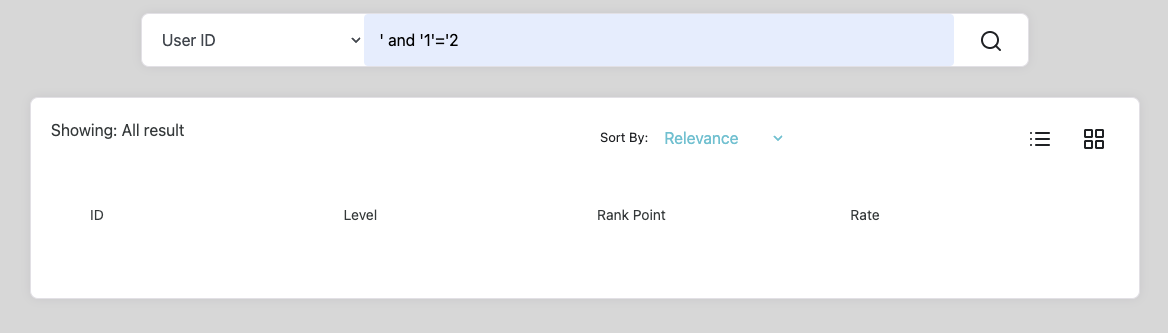 이번에는 틀린 조건을 주어 확인해 본 결과 없는 데이터를 검색했을 때와 결과가 같다. 이로써 SQL Injection이 정상적으로 작동하는 것을 알 수 있다.