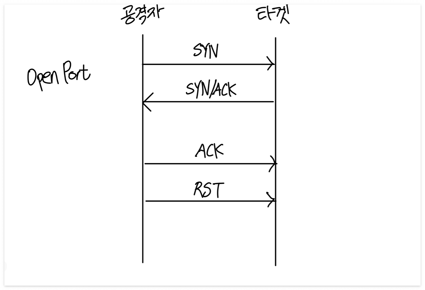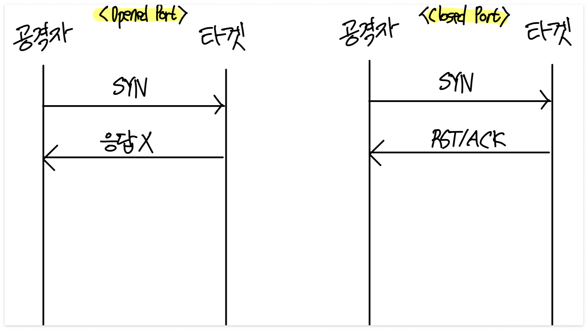 - 포트가 열린 경우, 목표 대상은 연결을 수행한 적이 없기에 응답을 하지 않는다.