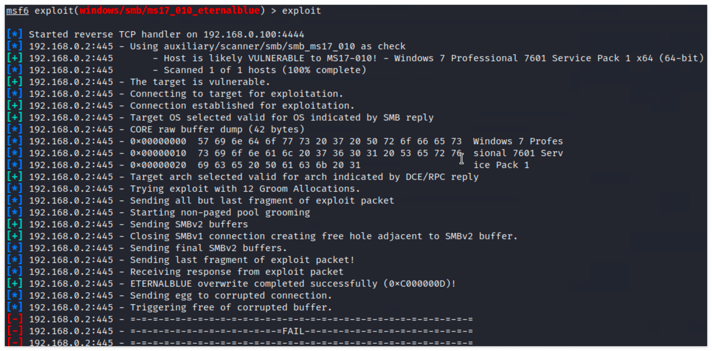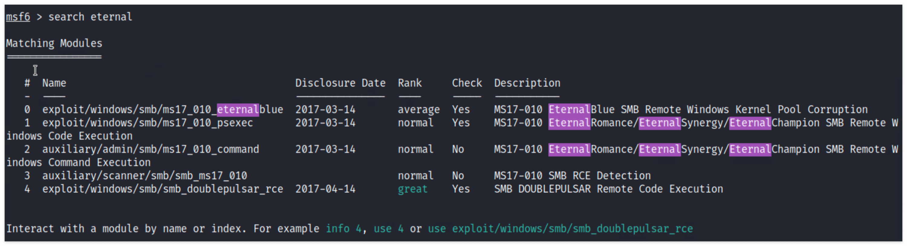 // 즉, 두 코드의 결론은 eternalblue 라는 취약점을 이용해서 공격(=사용)하겠다.