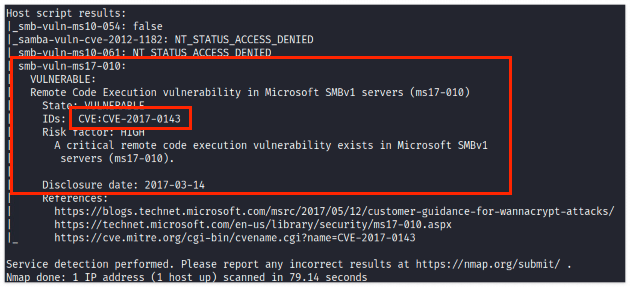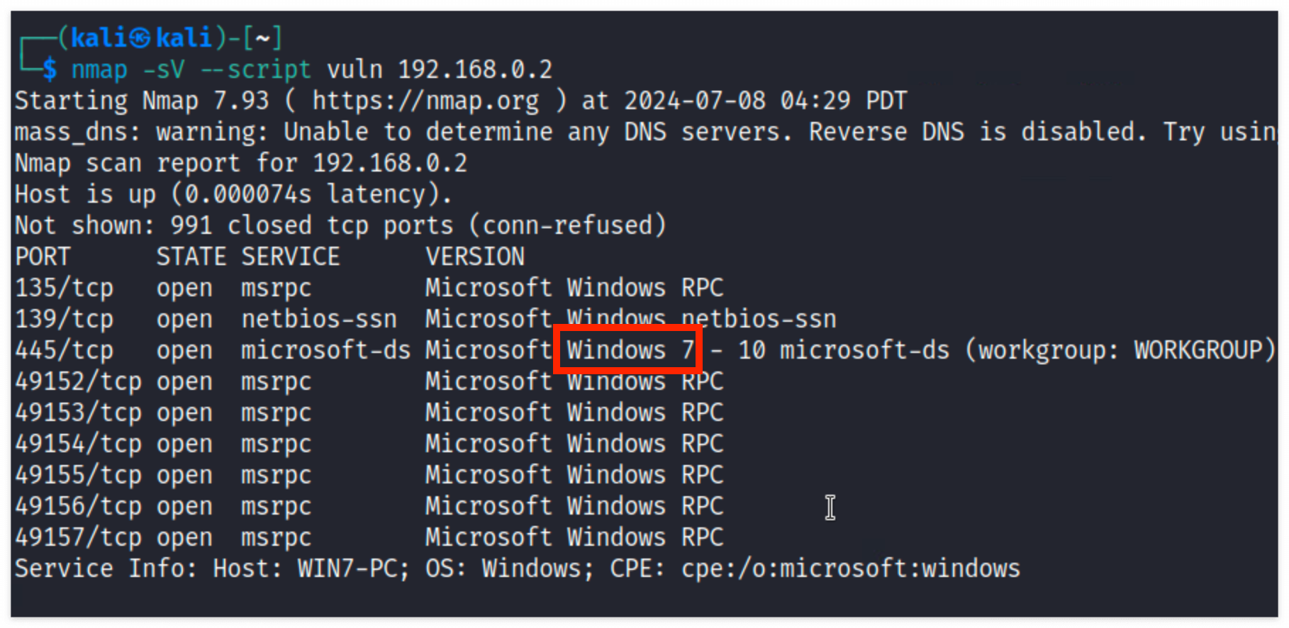 현재 윈도우7 환경의 운영체제의 열린 포트를 스캔하고 vuln 스크립트를 사용해서 취약점을 스캔했다. 스캔 결과로 CVE 코드를 확인할 수 있다.