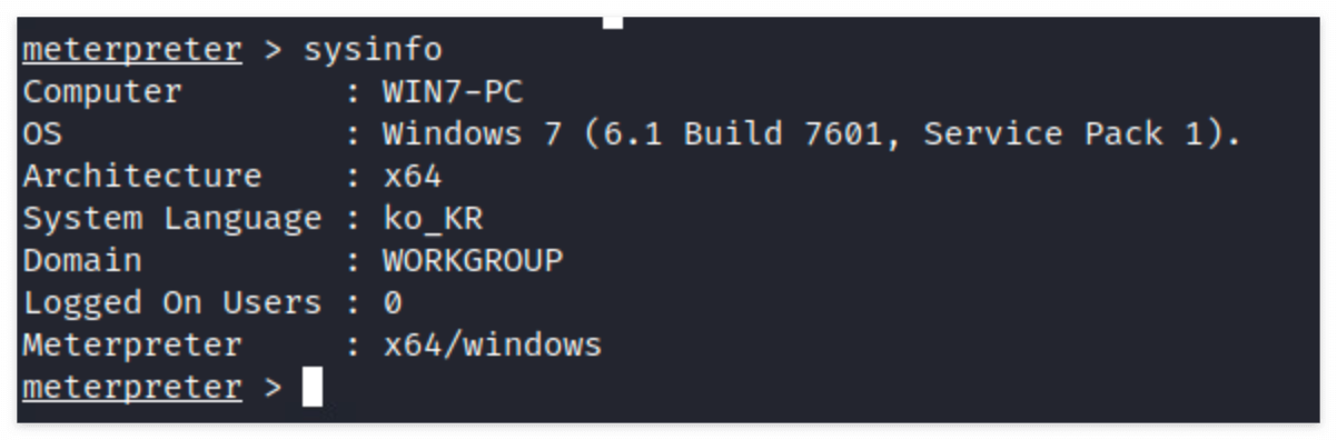 sysinfo -> 현재 탈취한(접속한) 시스템정보를 볼 수 있다.