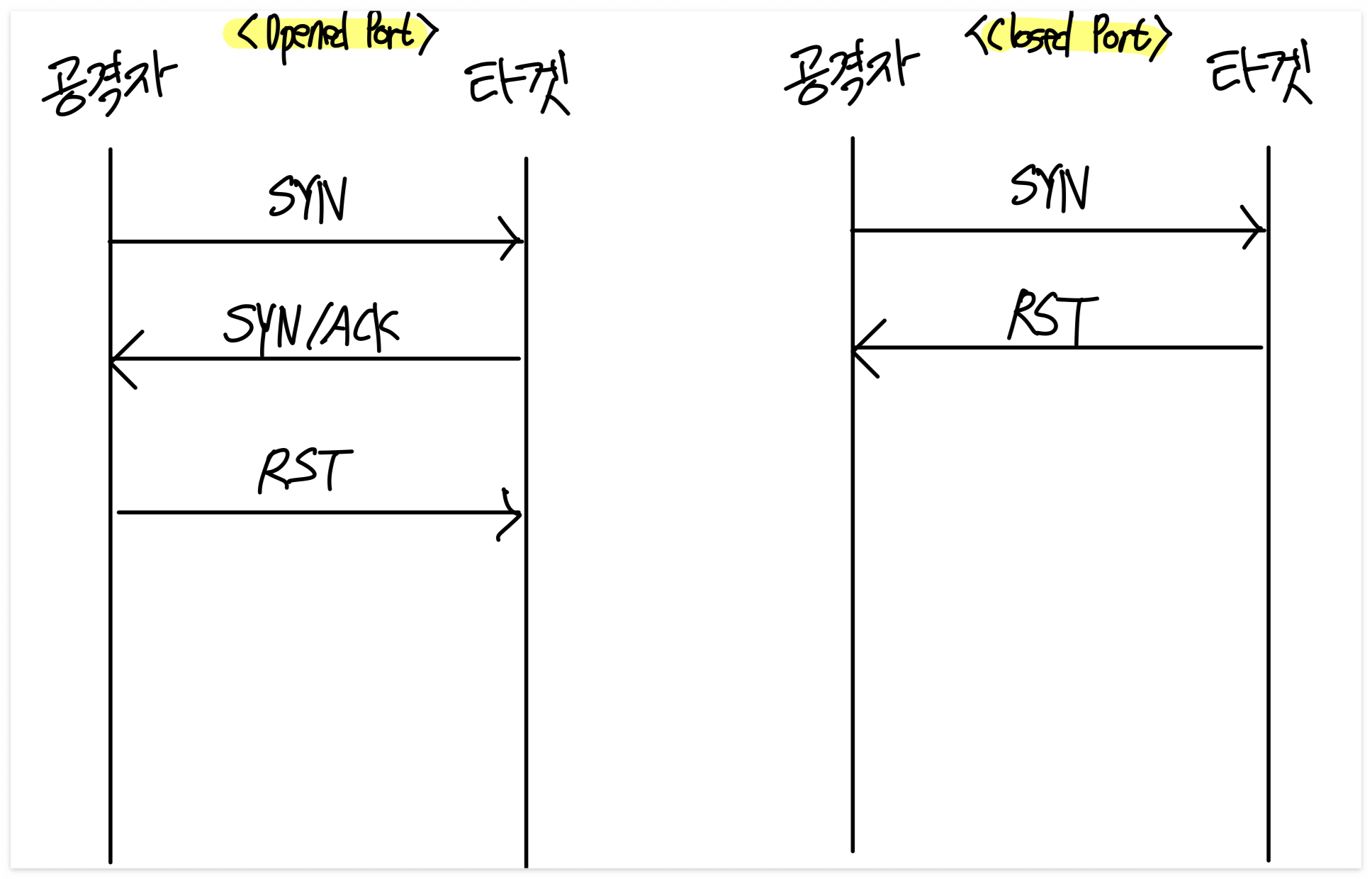 - 포트가 열린 경우, 열결 중간(3-Way HandShake 2단계)에 끊으며 연결 기록(로그)을 남기지 않음