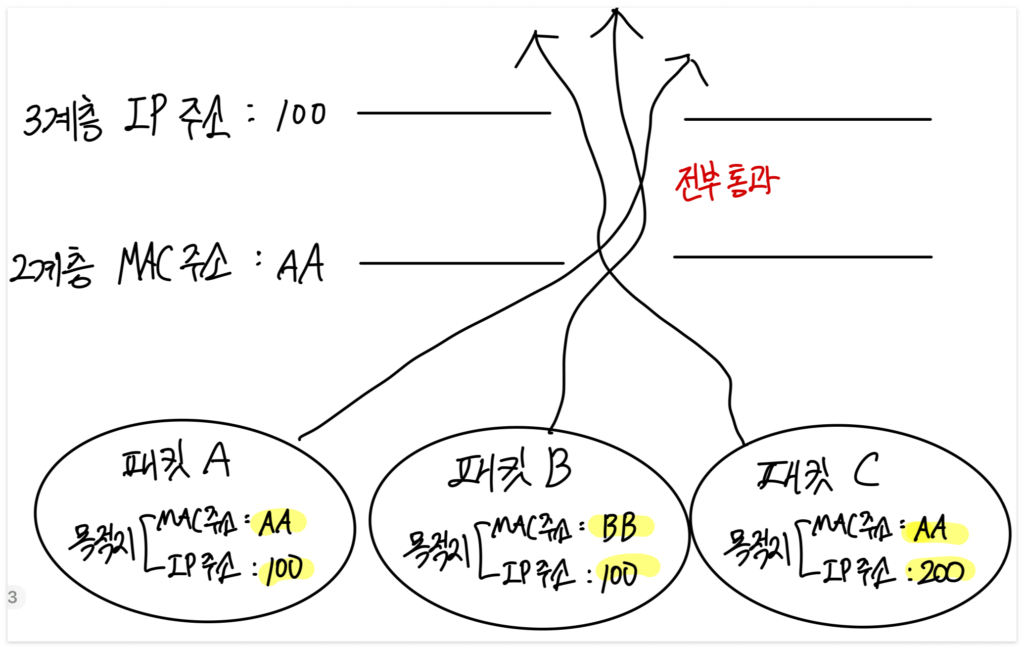 - 패킷의 IP, MAC 주소를 확인하여 버퍼에 저장할 지 여부를 결정하며 자신의 것과 일치하지 않으면 무시함