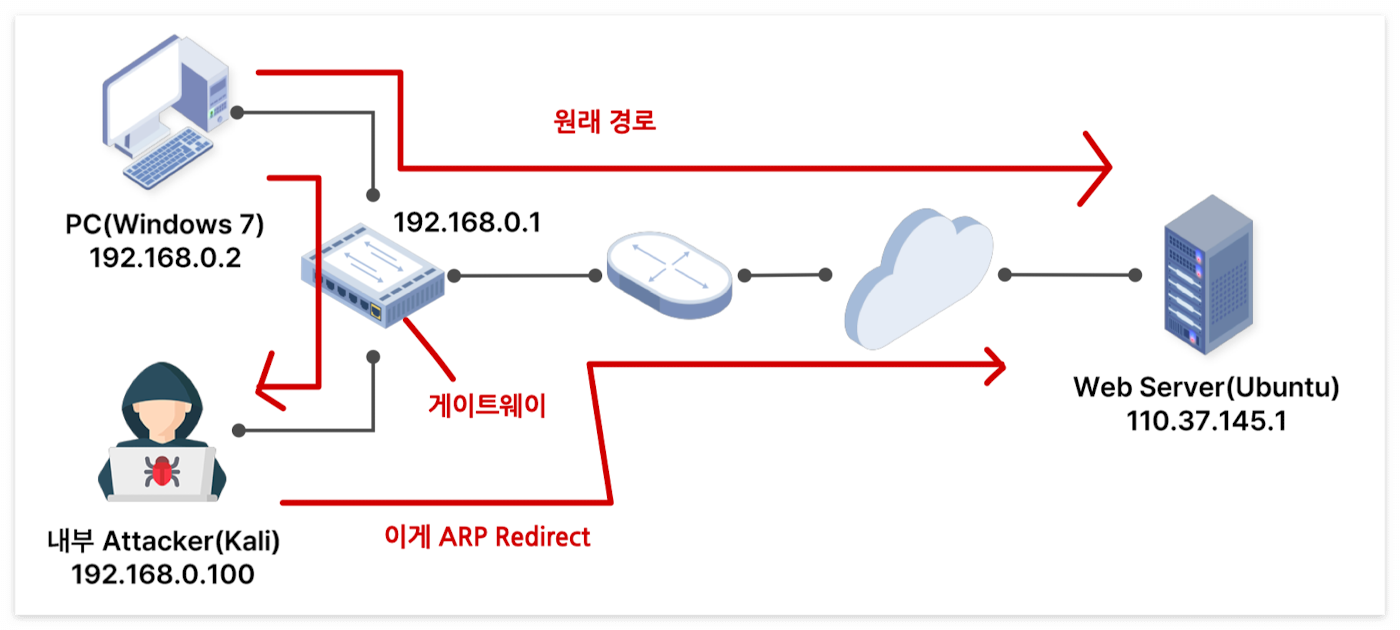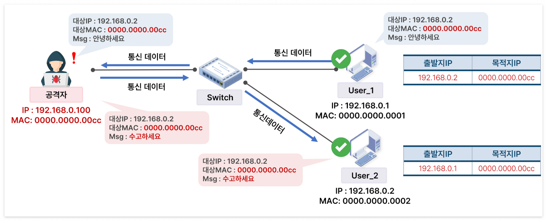 - 공격자가 통신 대상자인 것처럼 MAC 주소를 위조하고 상대방의 ARP 캐시 테이블을 오염시키는 원리다.