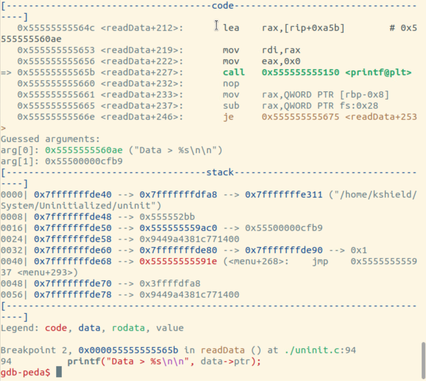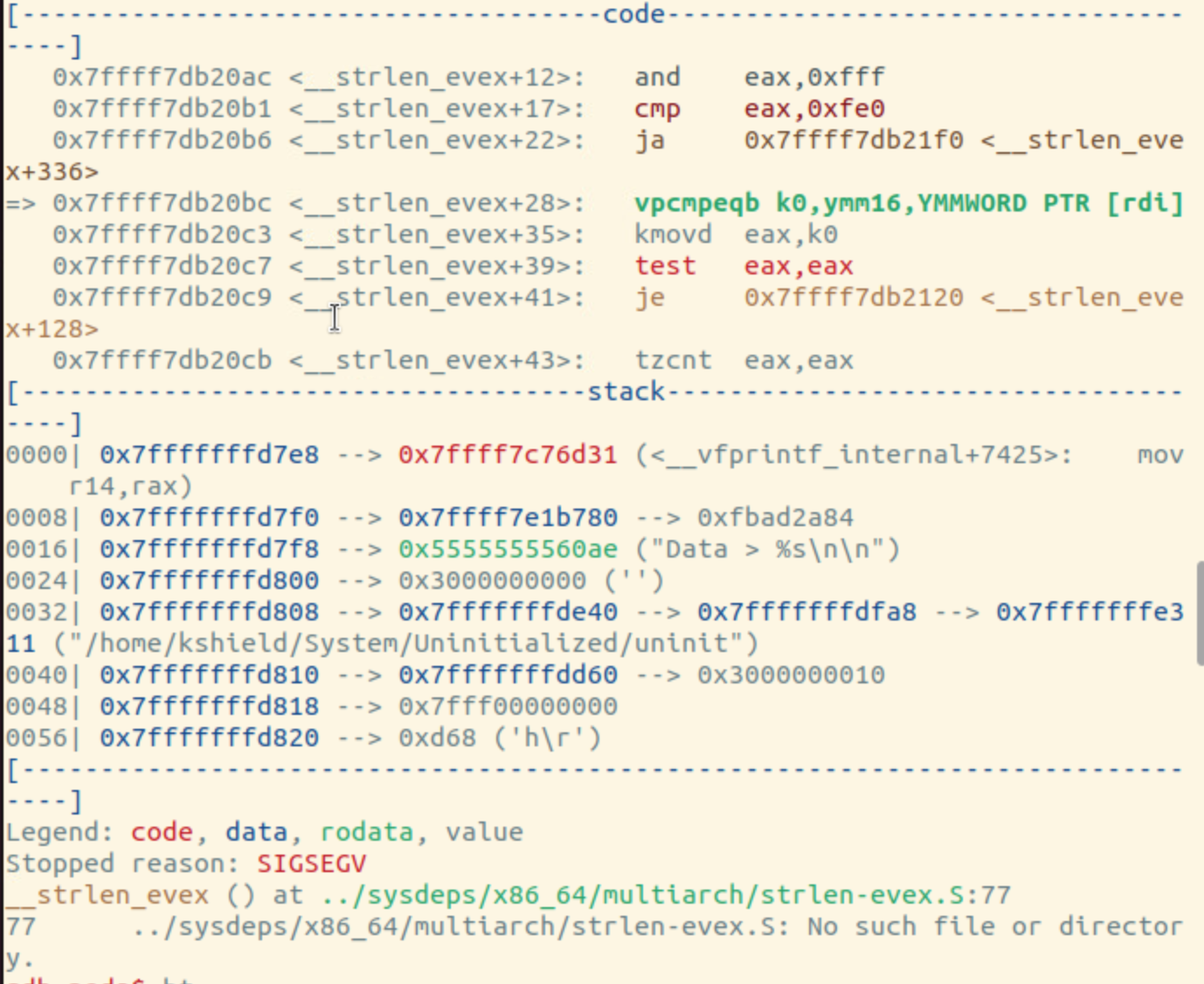 그래서 bt(back trace?)로 확인 해보니까 printf 쪽 문제 확인. 여기는 readData함수 발생 시 나오는 printf를 찾음