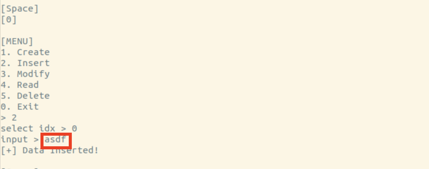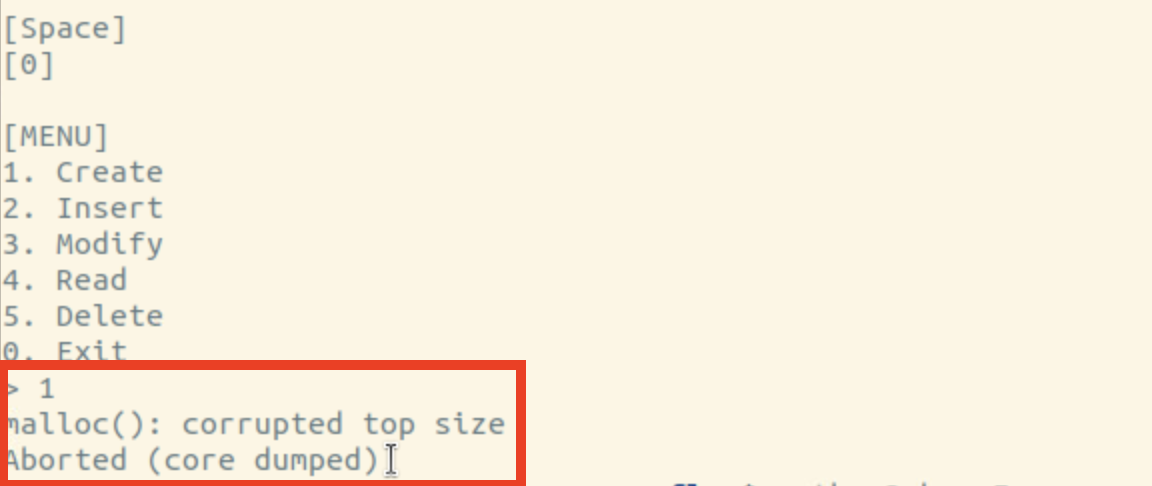 - Modify에선 BUF_SIZE만큼 입력 가능하기 때문에 heap overflow가 발생한다.
