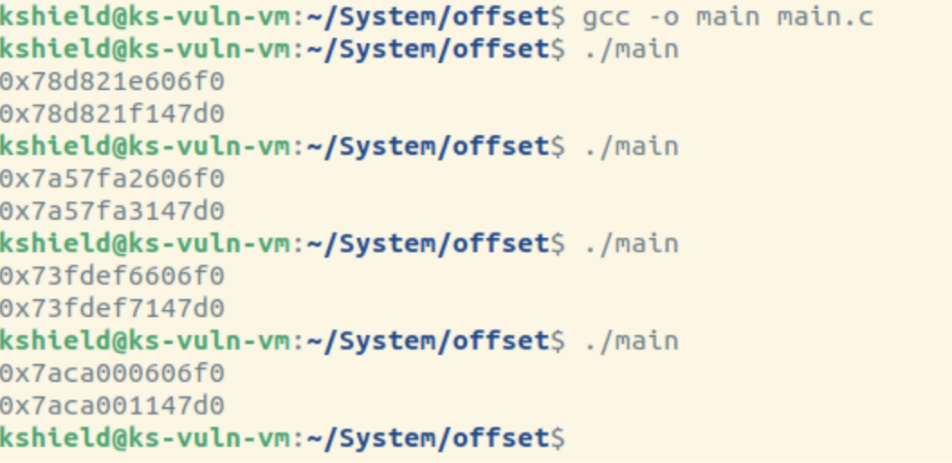 끝에 2자리는 같지만 앞자리가 계속 변경되는 것을 보고 ASLR이 적용되어 있다 알 수 있다.