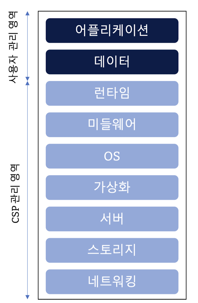 - CSP는 데이터센터부터 개발도구, DBMS 까지만 제공하고, 사용자가 애플리케이션을 통해 데이터를 직접 관리 및 처리함