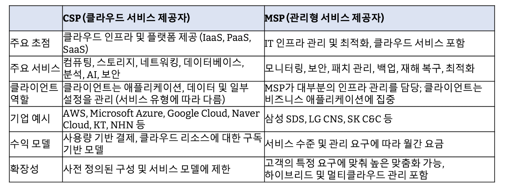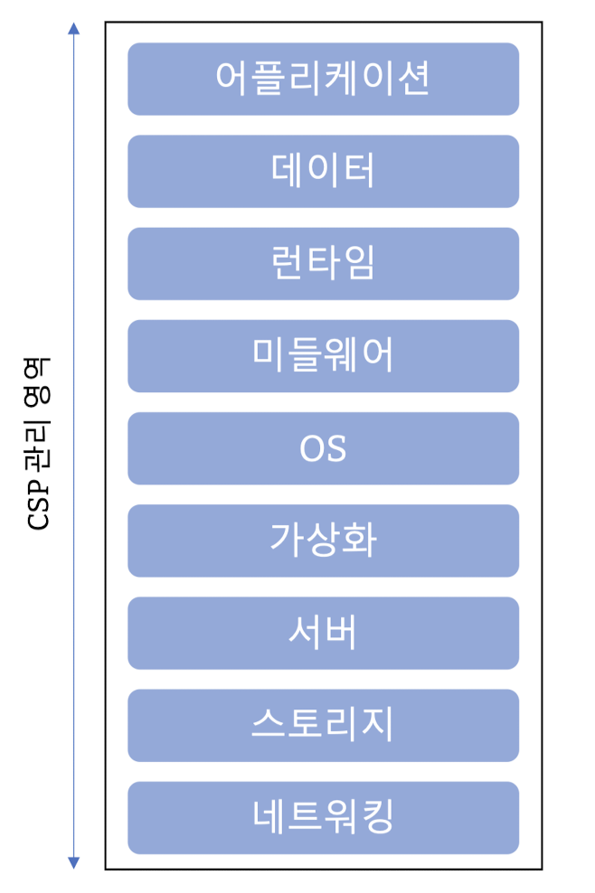 - CSP가 데이터 센터, 네트워킹 방화벽, 보안부터 애플리케이션의 비즈니스 분석까지의 모두를 관리 및 제공함